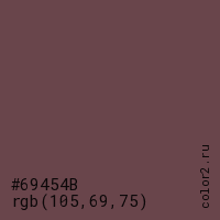 Цвет #69454B в цветовой модели RGB обозначается тремя октетами (105, 69, 75) в десятичном формате и #69454B в шестнадцатиричном (hex) формате, которые являются интенсивностью красного 105 (hex 69), интенсивность зелёного 69 (hex 45) и интенсивность синего 75 (hex 4B).