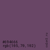 Цвет #694666 в цветовой модели RGB обозначается тремя октетами (105, 70, 102) в десятичном формате и #694666 в шестнадцатиричном (hex) формате, которые являются интенсивностью красного 105 (hex 69), интенсивность зелёного 70 (hex 46) и интенсивность синего 102 (hex 66).