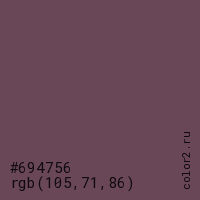 Цвет #694756 в цветовой модели RGB обозначается тремя октетами (105, 71, 86) в десятичном формате и #694756 в шестнадцатиричном (hex) формате, которые являются интенсивностью красного 105 (hex 69), интенсивность зелёного 71 (hex 47) и интенсивность синего 86 (hex 56).
