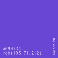 Цвет #6947D4 в цветовой модели RGB обозначается тремя октетами (105, 71, 212) в десятичном формате и #6947D4 в шестнадцатиричном (hex) формате, которые являются интенсивностью красного 105 (hex 69), интенсивность зелёного 71 (hex 47) и интенсивность синего 212 (hex D4).