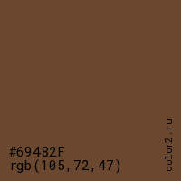 Цвет #69482F в цветовой модели RGB обозначается тремя октетами (105, 72, 47) в десятичном формате и #69482F в шестнадцатиричном (hex) формате, которые являются интенсивностью красного 105 (hex 69), интенсивность зелёного 72 (hex 48) и интенсивность синего 47 (hex 2F).
