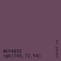 Цвет #69485E в цветовой модели RGB обозначается тремя октетами (105, 72, 94) в десятичном формате и #69485E в шестнадцатиричном (hex) формате, которые являются интенсивностью красного 105 (hex 69), интенсивность зелёного 72 (hex 48) и интенсивность синего 94 (hex 5E).
