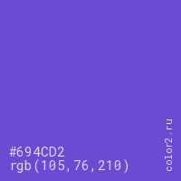 Цвет #694CD2 в цветовой модели RGB обозначается тремя октетами (105, 76, 210) в десятичном формате и #694CD2 в шестнадцатиричном (hex) формате, которые являются интенсивностью красного 105 (hex 69), интенсивность зелёного 76 (hex 4C) и интенсивность синего 210 (hex D2).