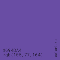 Цвет #694DA4 в цветовой модели RGB обозначается тремя октетами (105, 77, 164) в десятичном формате и #694DA4 в шестнадцатиричном (hex) формате, которые являются интенсивностью красного 105 (hex 69), интенсивность зелёного 77 (hex 4D) и интенсивность синего 164 (hex A4).