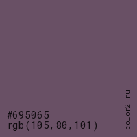 Цвет #695065 в цветовой модели RGB обозначается тремя октетами (105, 80, 101) в десятичном формате и #695065 в шестнадцатиричном (hex) формате, которые являются интенсивностью красного 105 (hex 69), интенсивность зелёного 80 (hex 50) и интенсивность синего 101 (hex 65).