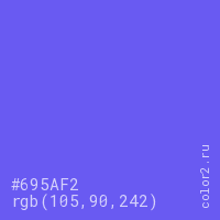 Цвет #695AF2 в цветовой модели RGB обозначается тремя октетами (105, 90, 242) в десятичном формате и #695AF2 в шестнадцатиричном (hex) формате, которые являются интенсивностью красного 105 (hex 69), интенсивность зелёного 90 (hex 5A) и интенсивность синего 242 (hex F2).