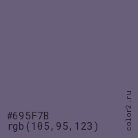 Цвет #695F7B в цветовой модели RGB обозначается тремя октетами (105, 95, 123) в десятичном формате и #695F7B в шестнадцатиричном (hex) формате, которые являются интенсивностью красного 105 (hex 69), интенсивность зелёного 95 (hex 5F) и интенсивность синего 123 (hex 7B).