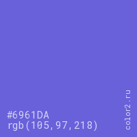 Цвет #6961DA в цветовой модели RGB обозначается тремя октетами (105, 97, 218) в десятичном формате и #6961DA в шестнадцатиричном (hex) формате, которые являются интенсивностью красного 105 (hex 69), интенсивность зелёного 97 (hex 61) и интенсивность синего 218 (hex DA).