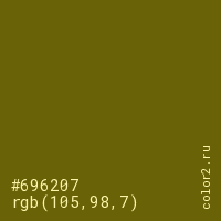 Цвет #696207 в цветовой модели RGB обозначается тремя октетами (105, 98, 7) в десятичном формате и #696207 в шестнадцатиричном (hex) формате, которые являются интенсивностью красного 105 (hex 69), интенсивность зелёного 98 (hex 62) и интенсивность синего 7 (hex 07).