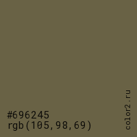 Цвет #696245 в цветовой модели RGB обозначается тремя октетами (105, 98, 69) в десятичном формате и #696245 в шестнадцатиричном (hex) формате, которые являются интенсивностью красного 105 (hex 69), интенсивность зелёного 98 (hex 62) и интенсивность синего 69 (hex 45).
