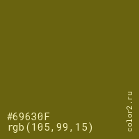 Цвет #69630F в цветовой модели RGB обозначается тремя октетами (105, 99, 15) в десятичном формате и #69630F в шестнадцатиричном (hex) формате, которые являются интенсивностью красного 105 (hex 69), интенсивность зелёного 99 (hex 63) и интенсивность синего 15 (hex 0F).