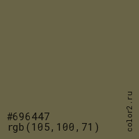 Цвет #696447 в цветовой модели RGB обозначается тремя октетами (105, 100, 71) в десятичном формате и #696447 в шестнадцатиричном (hex) формате, которые являются интенсивностью красного 105 (hex 69), интенсивность зелёного 100 (hex 64) и интенсивность синего 71 (hex 47).