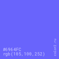 Цвет #6964FC в цветовой модели RGB обозначается тремя октетами (105, 100, 252) в десятичном формате и #6964FC в шестнадцатиричном (hex) формате, которые являются интенсивностью красного 105 (hex 69), интенсивность зелёного 100 (hex 64) и интенсивность синего 252 (hex FC).