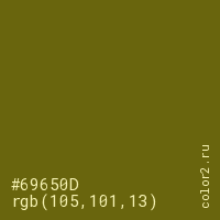 Цвет #69650D в цветовой модели RGB обозначается тремя октетами (105, 101, 13) в десятичном формате и #69650D в шестнадцатиричном (hex) формате, которые являются интенсивностью красного 105 (hex 69), интенсивность зелёного 101 (hex 65) и интенсивность синего 13 (hex 0D).