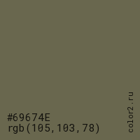 Цвет #69674E в цветовой модели RGB обозначается тремя октетами (105, 103, 78) в десятичном формате и #69674E в шестнадцатиричном (hex) формате, которые являются интенсивностью красного 105 (hex 69), интенсивность зелёного 103 (hex 67) и интенсивность синего 78 (hex 4E).