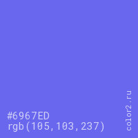 Цвет #6967ED в цветовой модели RGB обозначается тремя октетами (105, 103, 237) в десятичном формате и #6967ED в шестнадцатиричном (hex) формате, которые являются интенсивностью красного 105 (hex 69), интенсивность зелёного 103 (hex 67) и интенсивность синего 237 (hex ED).