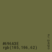 Цвет #696A3E в цветовой модели RGB обозначается тремя октетами (105, 106, 62) в десятичном формате и #696A3E в шестнадцатиричном (hex) формате, которые являются интенсивностью красного 105 (hex 69), интенсивность зелёного 106 (hex 6A) и интенсивность синего 62 (hex 3E).