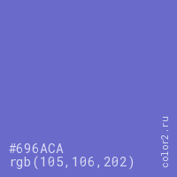 Цвет #696ACA в цветовой модели RGB обозначается тремя октетами (105, 106, 202) в десятичном формате и #696ACA в шестнадцатиричном (hex) формате, которые являются интенсивностью красного 105 (hex 69), интенсивность зелёного 106 (hex 6A) и интенсивность синего 202 (hex CA).