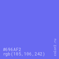 Цвет #696AF2 в цветовой модели RGB обозначается тремя октетами (105, 106, 242) в десятичном формате и #696AF2 в шестнадцатиричном (hex) формате, которые являются интенсивностью красного 105 (hex 69), интенсивность зелёного 106 (hex 6A) и интенсивность синего 242 (hex F2).