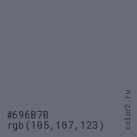 Цвет #696B7B в цветовой модели RGB обозначается тремя октетами (105, 107, 123) в десятичном формате и #696B7B в шестнадцатиричном (hex) формате, которые являются интенсивностью красного 105 (hex 69), интенсивность зелёного 107 (hex 6B) и интенсивность синего 123 (hex 7B).