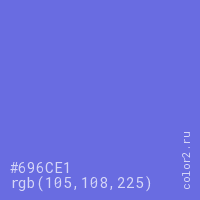 Цвет #696CE1 в цветовой модели RGB обозначается тремя октетами (105, 108, 225) в десятичном формате и #696CE1 в шестнадцатиричном (hex) формате, которые являются интенсивностью красного 105 (hex 69), интенсивность зелёного 108 (hex 6C) и интенсивность синего 225 (hex E1).