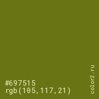 Цвет #697515 в цветовой модели RGB обозначается тремя октетами (105, 117, 21) в десятичном формате и #697515 в шестнадцатиричном (hex) формате, которые являются интенсивностью красного 105 (hex 69), интенсивность зелёного 117 (hex 75) и интенсивность синего 21 (hex 15).