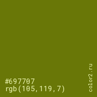 Цвет #697707 в цветовой модели RGB обозначается тремя октетами (105, 119, 7) в десятичном формате и #697707 в шестнадцатиричном (hex) формате, которые являются интенсивностью красного 105 (hex 69), интенсивность зелёного 119 (hex 77) и интенсивность синего 7 (hex 07).