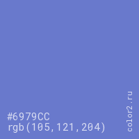 Цвет #6979CC в цветовой модели RGB обозначается тремя октетами (105, 121, 204) в десятичном формате и #6979CC в шестнадцатиричном (hex) формате, которые являются интенсивностью красного 105 (hex 69), интенсивность зелёного 121 (hex 79) и интенсивность синего 204 (hex CC).