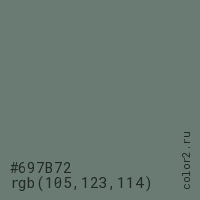 Цвет #697B72 в цветовой модели RGB обозначается тремя октетами (105, 123, 114) в десятичном формате и #697B72 в шестнадцатиричном (hex) формате, которые являются интенсивностью красного 105 (hex 69), интенсивность зелёного 123 (hex 7B) и интенсивность синего 114 (hex 72).