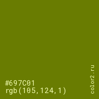 Цвет #697C01 в цветовой модели RGB обозначается тремя октетами (105, 124, 1) в десятичном формате и #697C01 в шестнадцатиричном (hex) формате, которые являются интенсивностью красного 105 (hex 69), интенсивность зелёного 124 (hex 7C) и интенсивность синего 1 (hex 01).