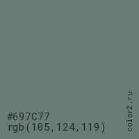 Цвет #697C77 в цветовой модели RGB обозначается тремя октетами (105, 124, 119) в десятичном формате и #697C77 в шестнадцатиричном (hex) формате, которые являются интенсивностью красного 105 (hex 69), интенсивность зелёного 124 (hex 7C) и интенсивность синего 119 (hex 77).