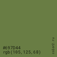 Цвет #697D44 в цветовой модели RGB обозначается тремя октетами (105, 125, 68) в десятичном формате и #697D44 в шестнадцатиричном (hex) формате, которые являются интенсивностью красного 105 (hex 69), интенсивность зелёного 125 (hex 7D) и интенсивность синего 68 (hex 44).