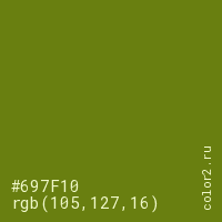 Цвет #697F10 в цветовой модели RGB обозначается тремя октетами (105, 127, 16) в десятичном формате и #697F10 в шестнадцатиричном (hex) формате, которые являются интенсивностью красного 105 (hex 69), интенсивность зелёного 127 (hex 7F) и интенсивность синего 16 (hex 10).