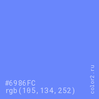 Цвет #6986FC в цветовой модели RGB обозначается тремя октетами (105, 134, 252) в десятичном формате и #6986FC в шестнадцатиричном (hex) формате, которые являются интенсивностью красного 105 (hex 69), интенсивность зелёного 134 (hex 86) и интенсивность синего 252 (hex FC).
