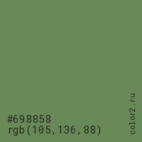 Цвет #698858 в цветовой модели RGB обозначается тремя октетами (105, 136, 88) в десятичном формате и #698858 в шестнадцатиричном (hex) формате, которые являются интенсивностью красного 105 (hex 69), интенсивность зелёного 136 (hex 88) и интенсивность синего 88 (hex 58).