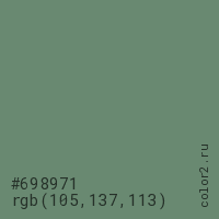 Цвет #698971 в цветовой модели RGB обозначается тремя октетами (105, 137, 113) в десятичном формате и #698971 в шестнадцатиричном (hex) формате, которые являются интенсивностью красного 105 (hex 69), интенсивность зелёного 137 (hex 89) и интенсивность синего 113 (hex 71).