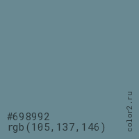 Цвет #698992 в цветовой модели RGB обозначается тремя октетами (105, 137, 146) в десятичном формате и #698992 в шестнадцатиричном (hex) формате, которые являются интенсивностью красного 105 (hex 69), интенсивность зелёного 137 (hex 89) и интенсивность синего 146 (hex 92).