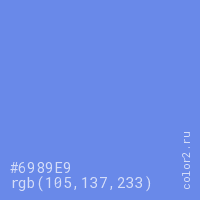 Цвет #6989E9 в цветовой модели RGB обозначается тремя октетами (105, 137, 233) в десятичном формате и #6989E9 в шестнадцатиричном (hex) формате, которые являются интенсивностью красного 105 (hex 69), интенсивность зелёного 137 (hex 89) и интенсивность синего 233 (hex E9).