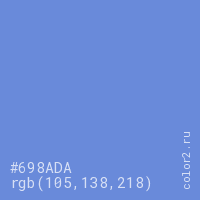 Цвет #698ADA в цветовой модели RGB обозначается тремя октетами (105, 138, 218) в десятичном формате и #698ADA в шестнадцатиричном (hex) формате, которые являются интенсивностью красного 105 (hex 69), интенсивность зелёного 138 (hex 8A) и интенсивность синего 218 (hex DA).