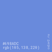 Цвет #698ADC в цветовой модели RGB обозначается тремя октетами (105, 138, 220) в десятичном формате и #698ADC в шестнадцатиричном (hex) формате, которые являются интенсивностью красного 105 (hex 69), интенсивность зелёного 138 (hex 8A) и интенсивность синего 220 (hex DC).