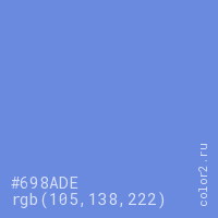 Цвет #698ADE в цветовой модели RGB обозначается тремя октетами (105, 138, 222) в десятичном формате и #698ADE в шестнадцатиричном (hex) формате, которые являются интенсивностью красного 105 (hex 69), интенсивность зелёного 138 (hex 8A) и интенсивность синего 222 (hex DE).