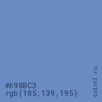 Цвет #698BC3 в цветовой модели RGB обозначается тремя октетами (105, 139, 195) в десятичном формате и #698BC3 в шестнадцатиричном (hex) формате, которые являются интенсивностью красного 105 (hex 69), интенсивность зелёного 139 (hex 8B) и интенсивность синего 195 (hex C3).