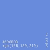 Цвет #698BDB в цветовой модели RGB обозначается тремя октетами (105, 139, 219) в десятичном формате и #698BDB в шестнадцатиричном (hex) формате, которые являются интенсивностью красного 105 (hex 69), интенсивность зелёного 139 (hex 8B) и интенсивность синего 219 (hex DB).