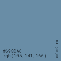 Цвет #698DA6 в цветовой модели RGB обозначается тремя октетами (105, 141, 166) в десятичном формате и #698DA6 в шестнадцатиричном (hex) формате, которые являются интенсивностью красного 105 (hex 69), интенсивность зелёного 141 (hex 8D) и интенсивность синего 166 (hex A6).