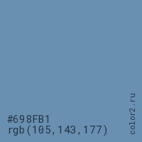 Цвет #698FB1 в цветовой модели RGB обозначается тремя октетами (105, 143, 177) в десятичном формате и #698FB1 в шестнадцатиричном (hex) формате, которые являются интенсивностью красного 105 (hex 69), интенсивность зелёного 143 (hex 8F) и интенсивность синего 177 (hex B1).