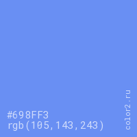Цвет #698FF3 в цветовой модели RGB обозначается тремя октетами (105, 143, 243) в десятичном формате и #698FF3 в шестнадцатиричном (hex) формате, которые являются интенсивностью красного 105 (hex 69), интенсивность зелёного 143 (hex 8F) и интенсивность синего 243 (hex F3).