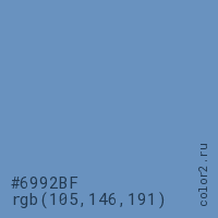 Цвет #6992BF в цветовой модели RGB обозначается тремя октетами (105, 146, 191) в десятичном формате и #6992BF в шестнадцатиричном (hex) формате, которые являются интенсивностью красного 105 (hex 69), интенсивность зелёного 146 (hex 92) и интенсивность синего 191 (hex BF).