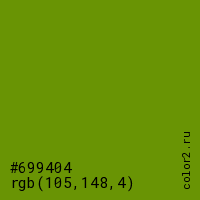 Цвет #699404 в цветовой модели RGB обозначается тремя октетами (105, 148, 4) в десятичном формате и #699404 в шестнадцатиричном (hex) формате, которые являются интенсивностью красного 105 (hex 69), интенсивность зелёного 148 (hex 94) и интенсивность синего 4 (hex 04).