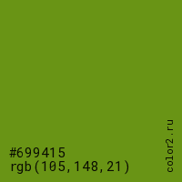 Цвет #699415 в цветовой модели RGB обозначается тремя октетами (105, 148, 21) в десятичном формате и #699415 в шестнадцатиричном (hex) формате, которые являются интенсивностью красного 105 (hex 69), интенсивность зелёного 148 (hex 94) и интенсивность синего 21 (hex 15).