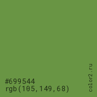 Цвет #699544 в цветовой модели RGB обозначается тремя октетами (105, 149, 68) в десятичном формате и #699544 в шестнадцатиричном (hex) формате, которые являются интенсивностью красного 105 (hex 69), интенсивность зелёного 149 (hex 95) и интенсивность синего 68 (hex 44).